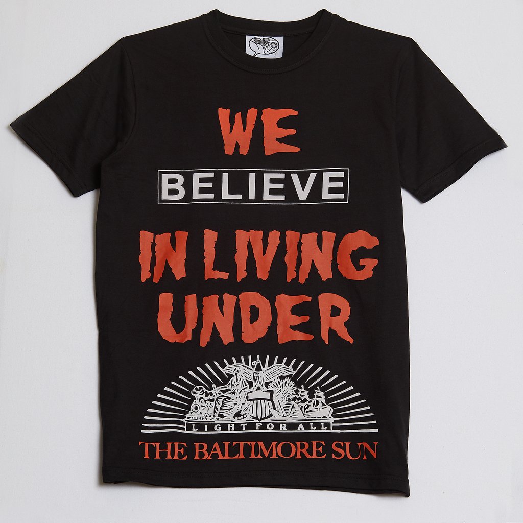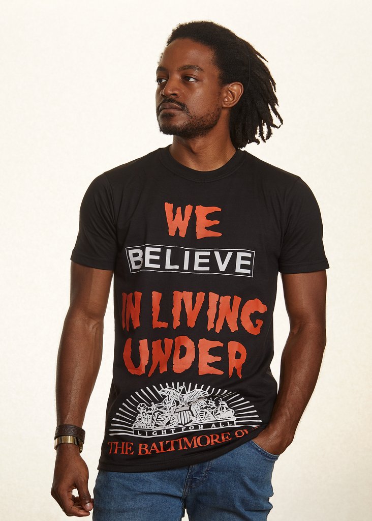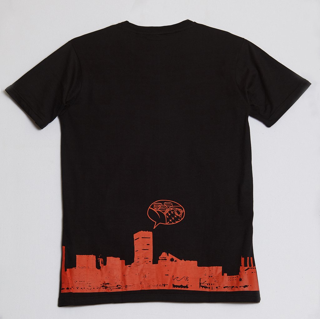 Status Apparatus emerges with a signature print with several Charm City references that form a statement about the brand’s love for the city. Celebrating 10 years since the shirt’s release, it is a fan favorite. Dressed in black cotton, finished with a ribbed crewneck, this is an addition to any wardrobe.